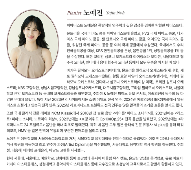 피아니스트 노예진은 탁월한 앙상블 감각으로 국내외 정상급 연주자들과 호흡을 맞춰온 연주자입니다. 섬세하고 균형 잡힌 터치로 첼로와의 완벽한 조화를 이끌어내는 것으로 정평이 나 있습니다.