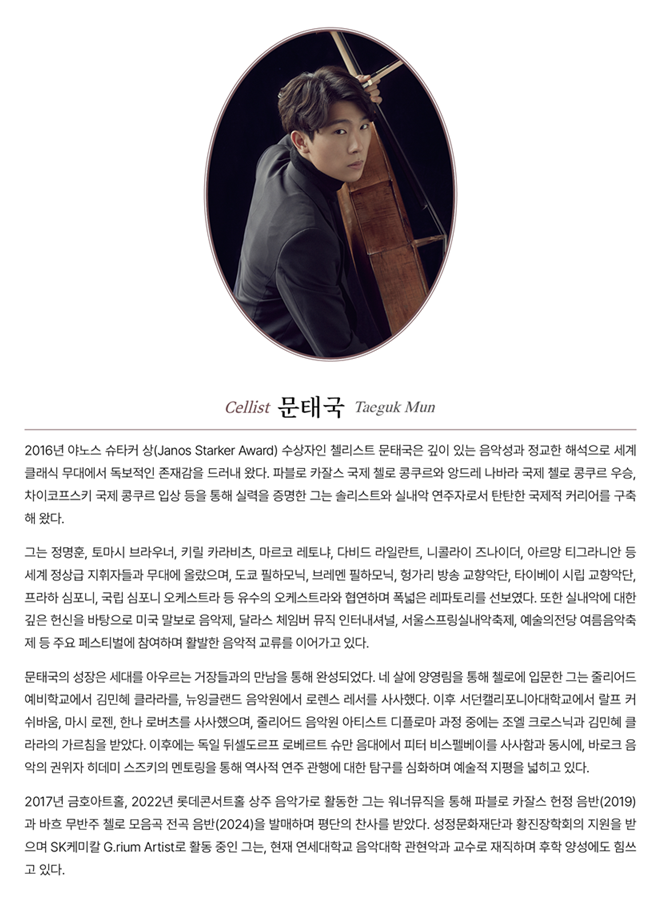 첼리스트 문태극은 한국예술종합학교에서 수학 후 독일 크론베르크 아카데미에서 공부한 세계적인 첼리스트입니다. 뮌헨 국제 콩쿠르 등 권위 있는 국제 콩쿠르에서 입상하며 실력을 인정받았으며, 유럽과 아시아를 무대로 활발한 연주 활동을 펼치고 있습니다. 풍부한 음색과 깊이 있는 해석으로 베토벤 소나타의 진수를 들려줄 것으로 기대됩니다.
